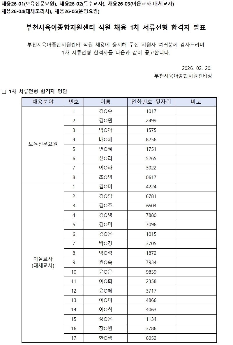[센터] 26-01,02,03,04,05 직원 채용 1차 서류전형 합격자 발표