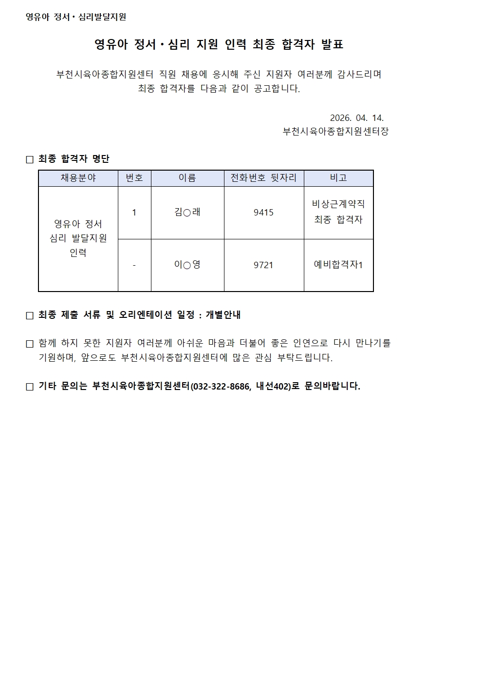 [센터] [비상근채용] 2026 영유아 정서·심리 발달 지원사업 인력 최종 합격자 발표