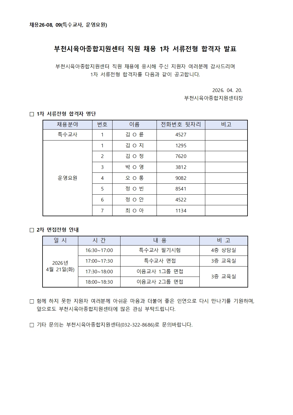 [센터] 26-08, 09 특수교사, 운영요원 직원 채용 1차 서류전형 합격자 발표