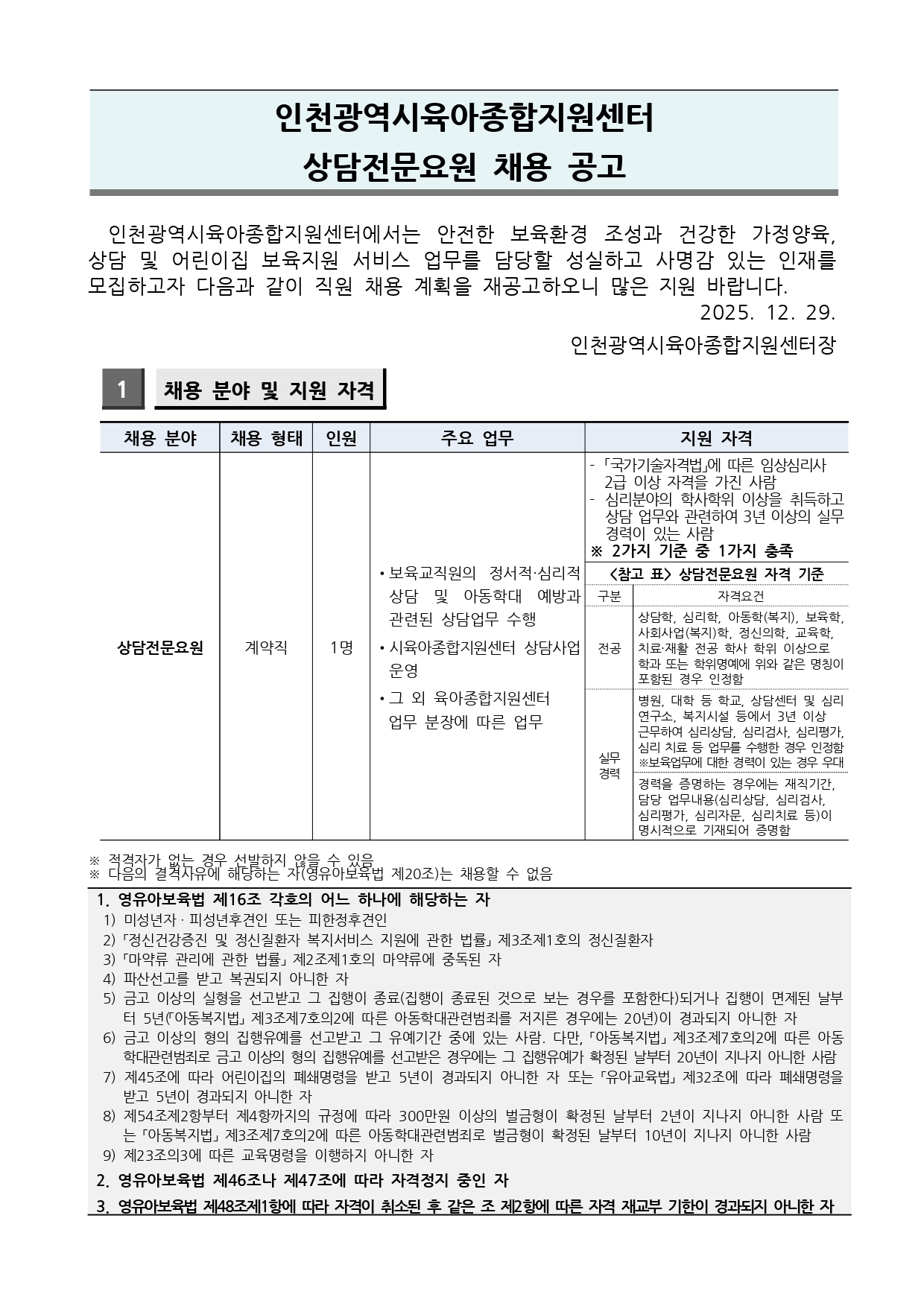 [외부] [인천광역시육아종합지원센터] 직원(상담전문요원) 채용 재공고
