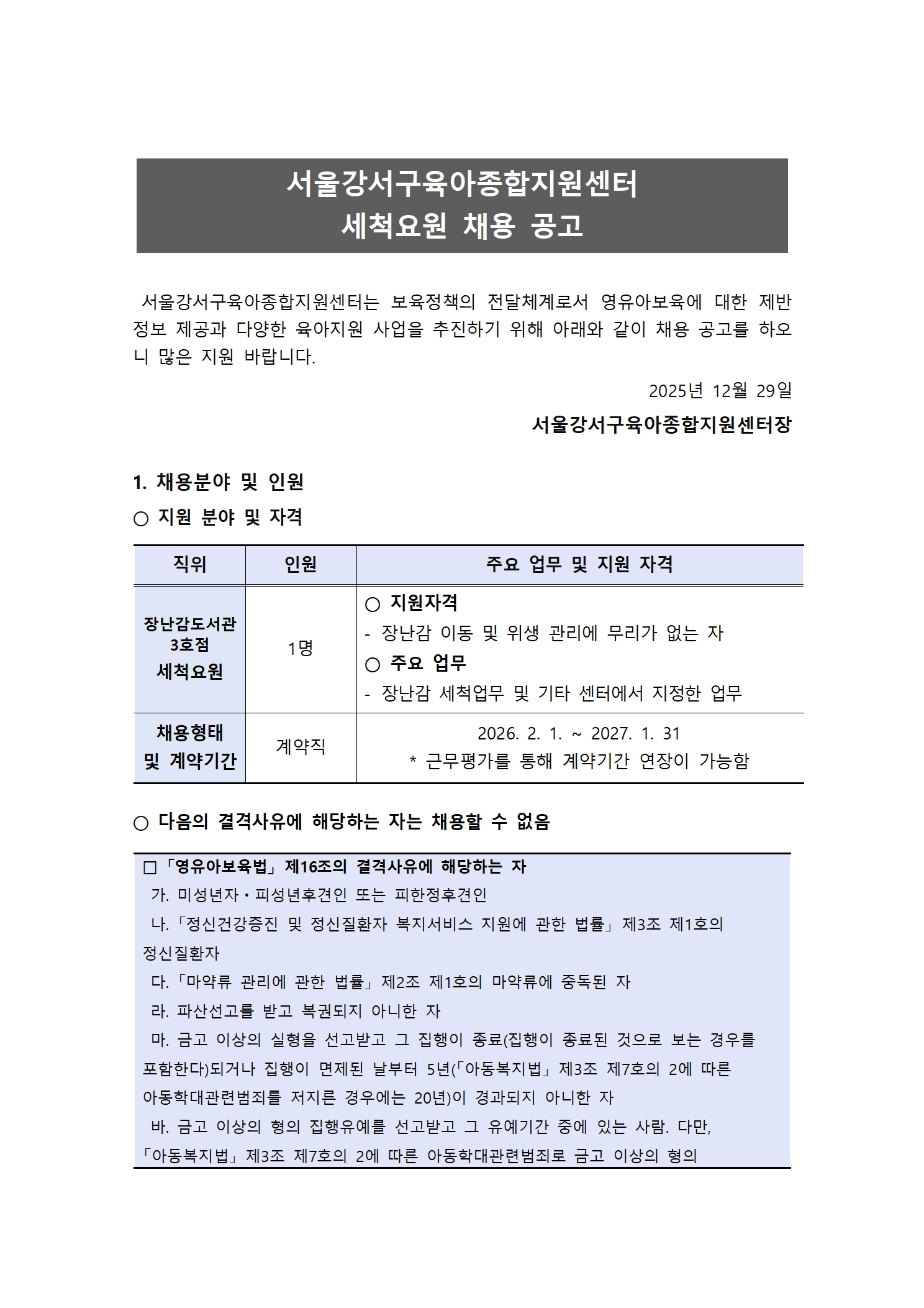 [외부] [서울시강서구육아종합지원센터] 직원(세척요원) 채용 공고