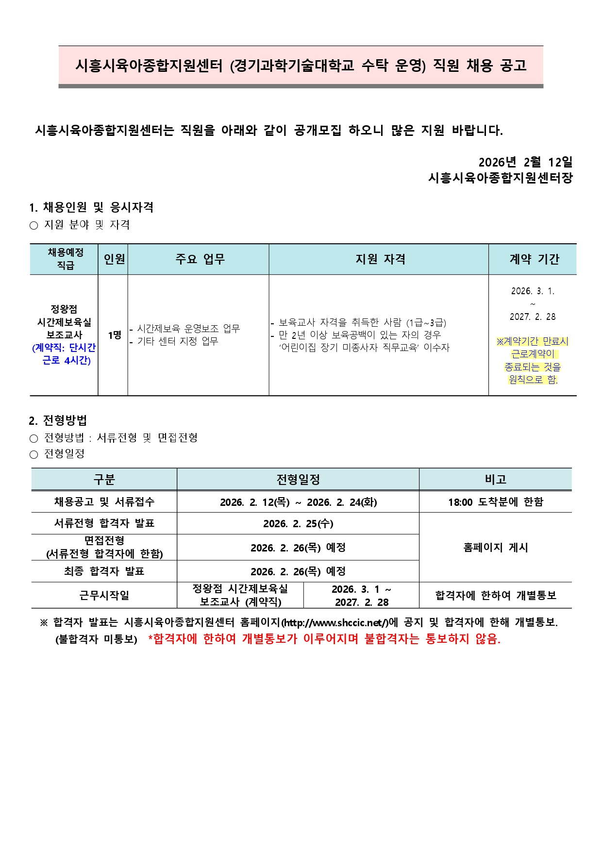 [외부] [시흥시육아종합지원센터] 직원(시간제보조교사-정왕점) 채용 안내