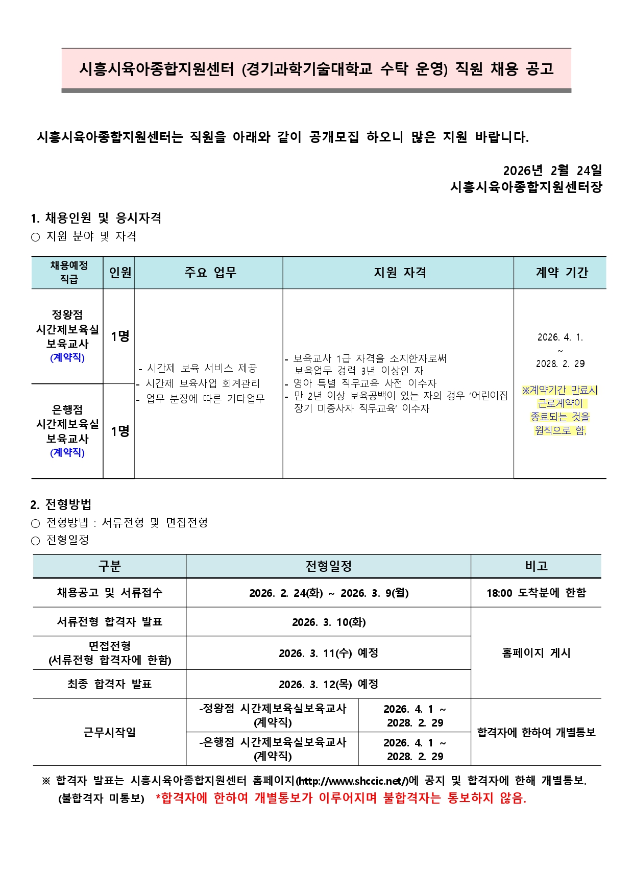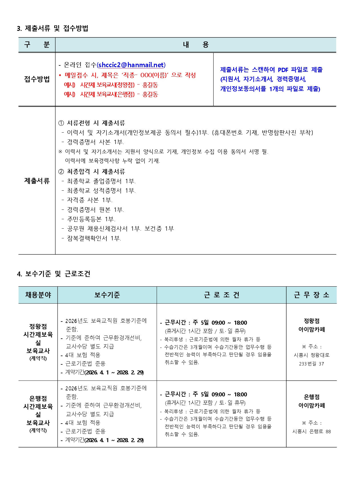 [외부] [시흥시육아종합지원센터] 직원(시간제교사-정왕점,은행점) 채용 안내