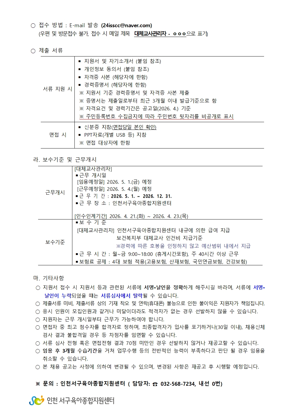 [외부] [인천서구육아종합지원센터] 직원(대체교사관리자) 채용 안내
