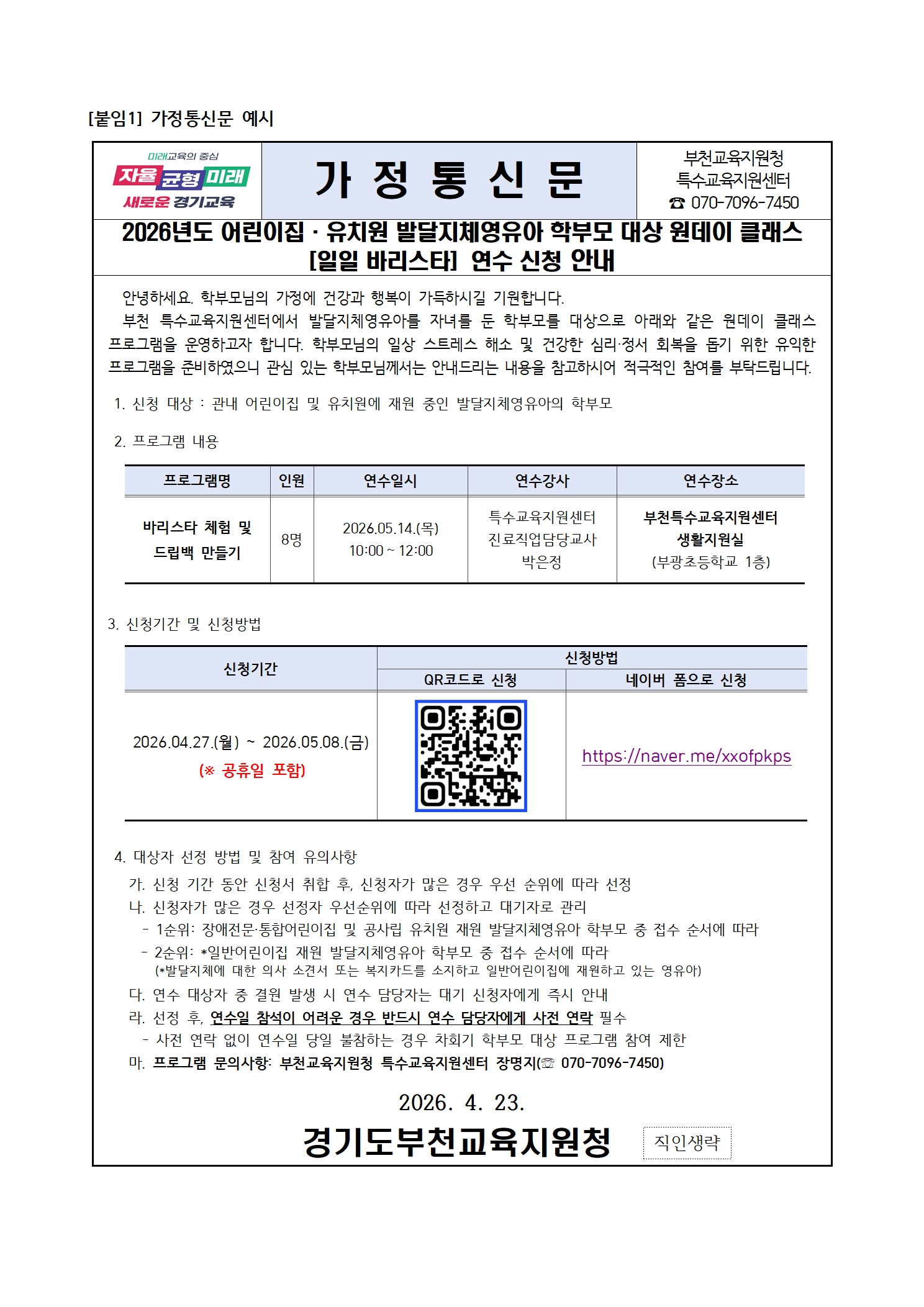 [외부] [경기도부천교육지원청] 어린이집·유치원 발달지체영유아 학부모 대상 원데이 클래스 [일일 바리스타] 연수 안내