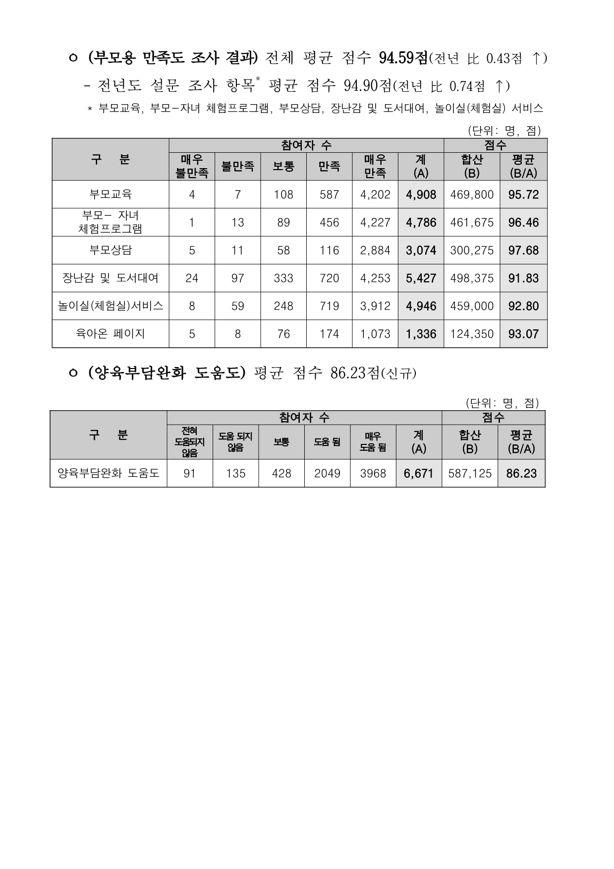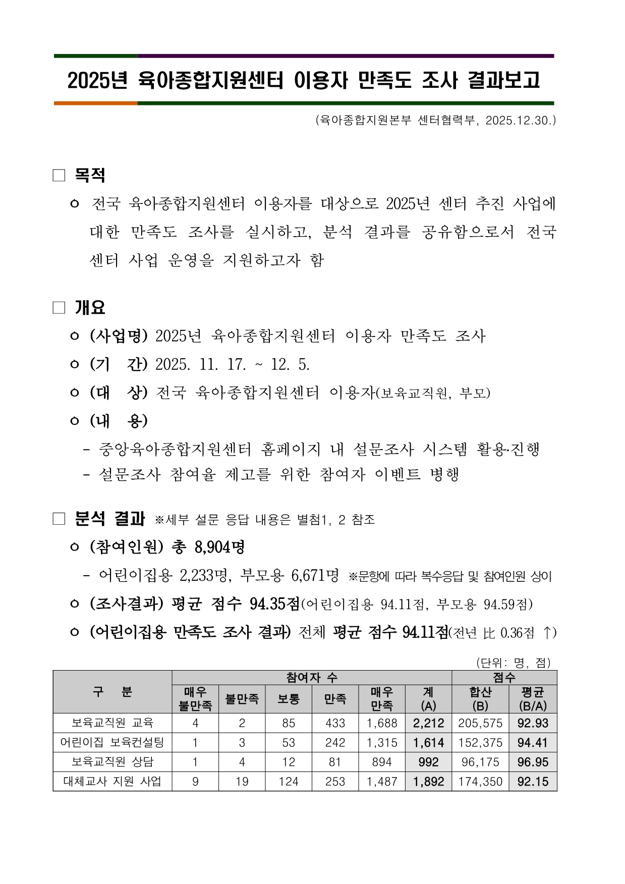 2025년 전국 육아종합지원센터 이용자 만족도 조사 결과를 보고합니다.