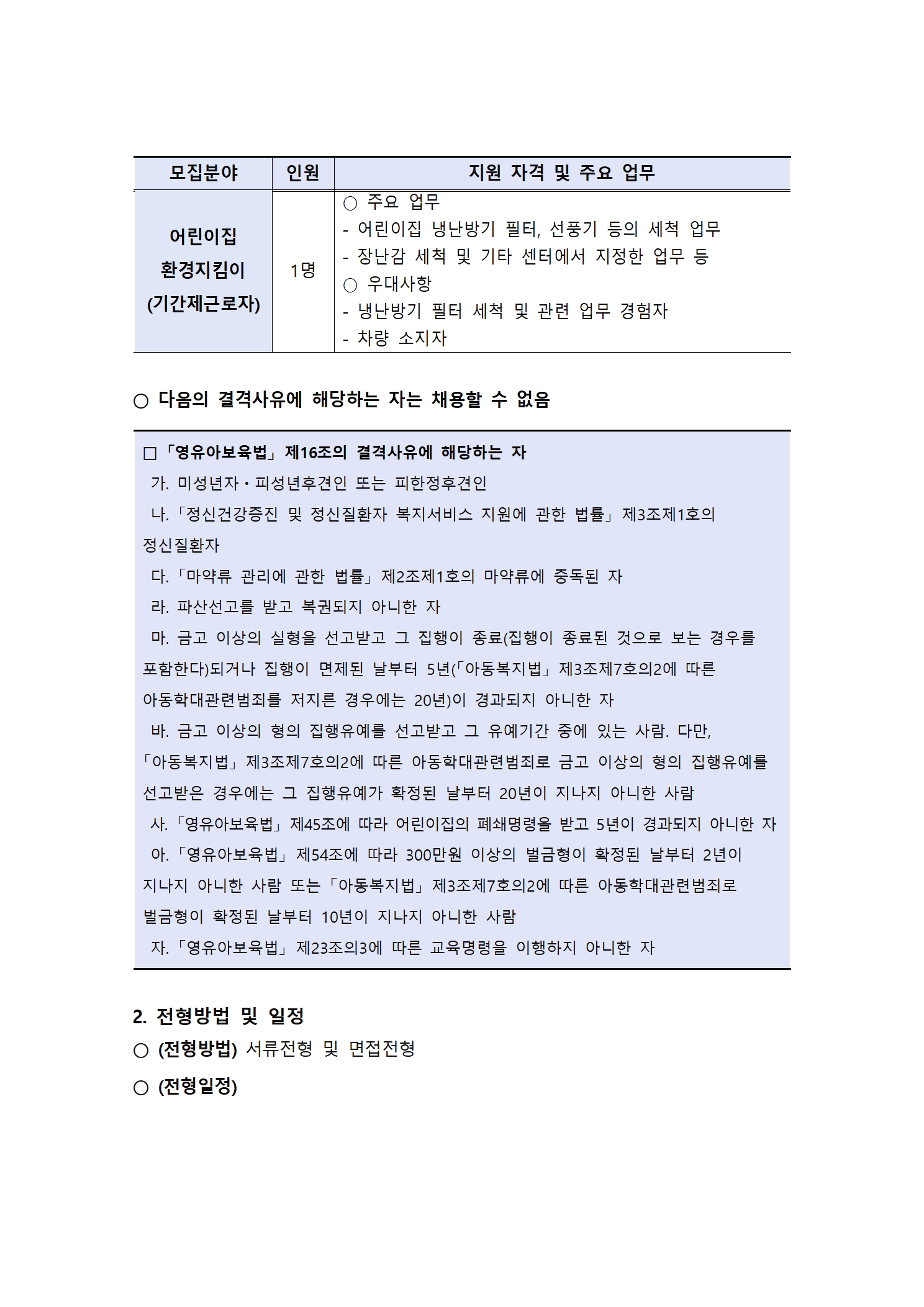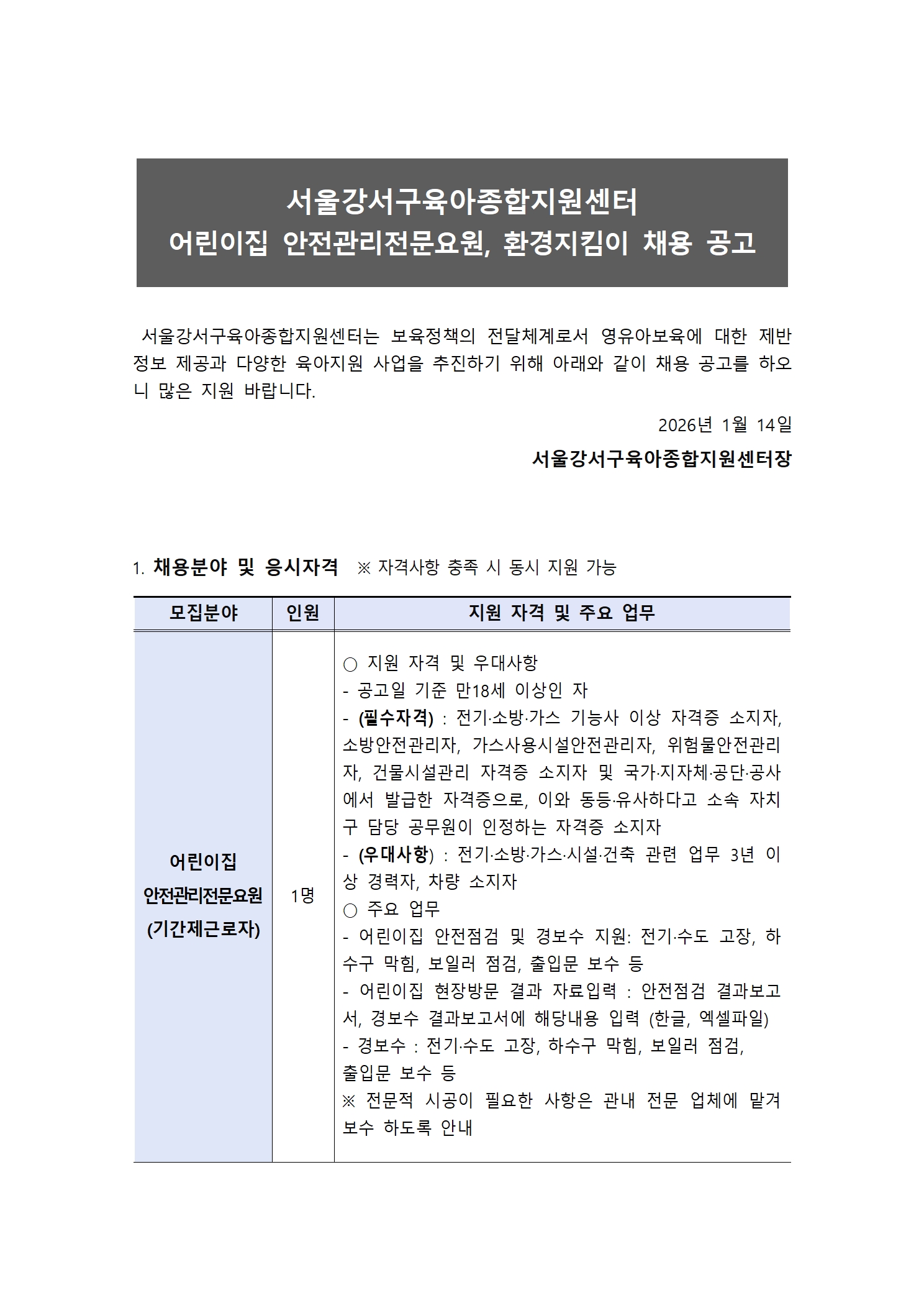 [외부] [서울강서구육아종합지원센터] 직원(안전관리전문요원, 환경지킴이) 채용 안내