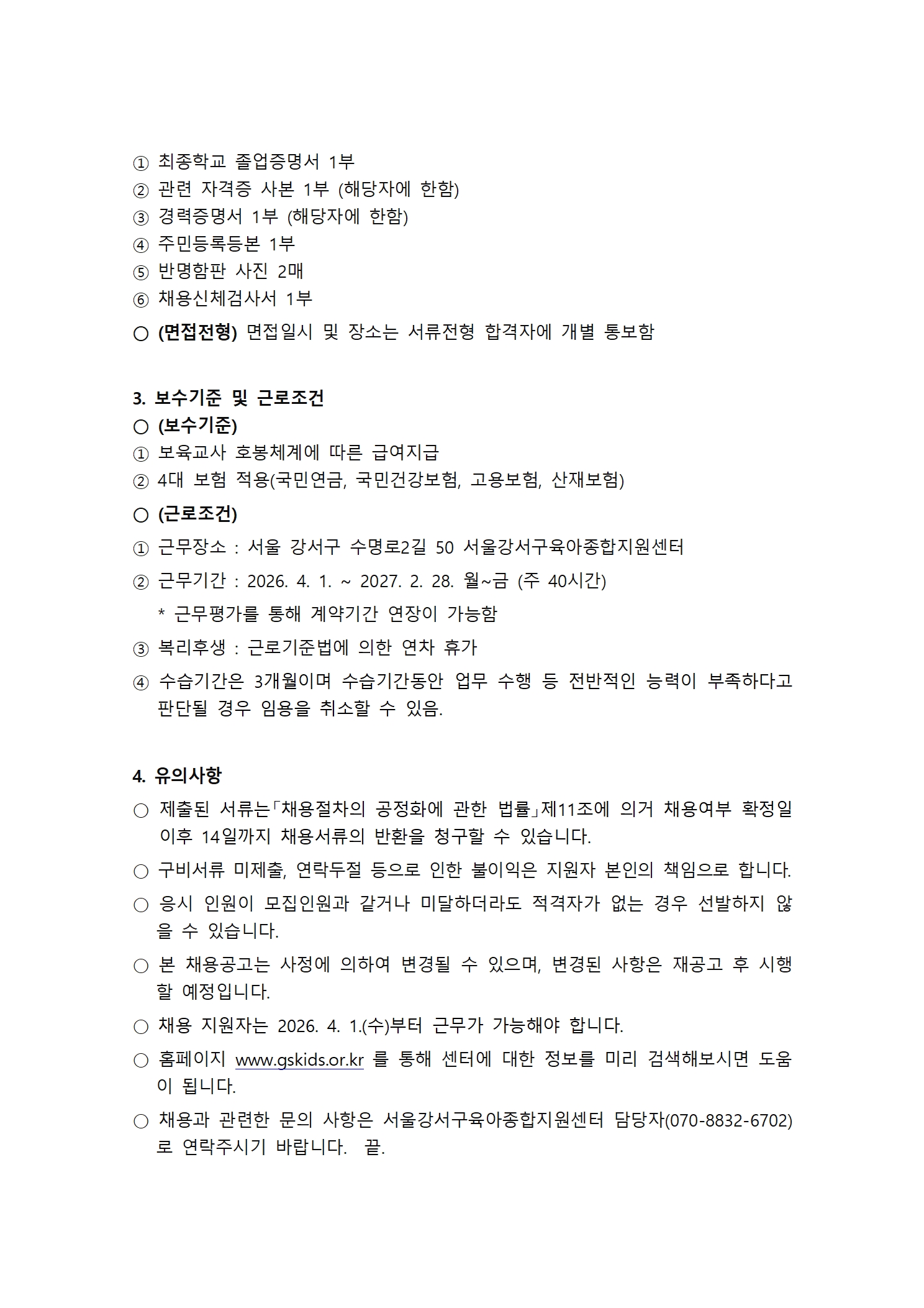 [외부] [서울강서구육아종합지원센터] 직원(시간제보육교사) 채용 안내