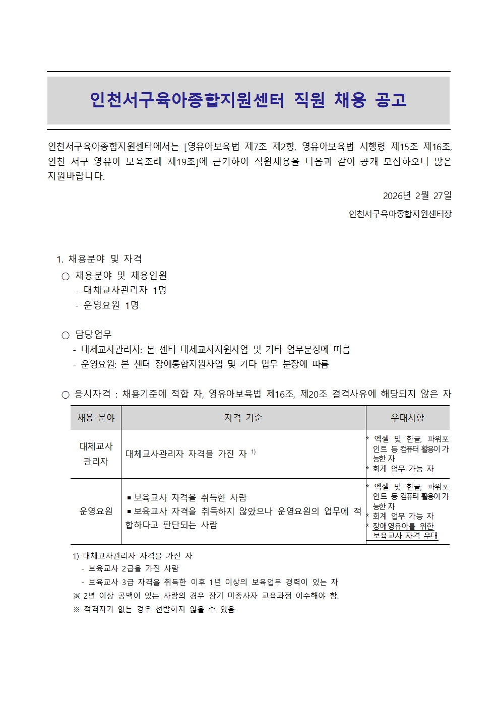 [외부] [인천서구육아종합지원센터] 직원 채용 공고(대체교사관리자, 운영요원)