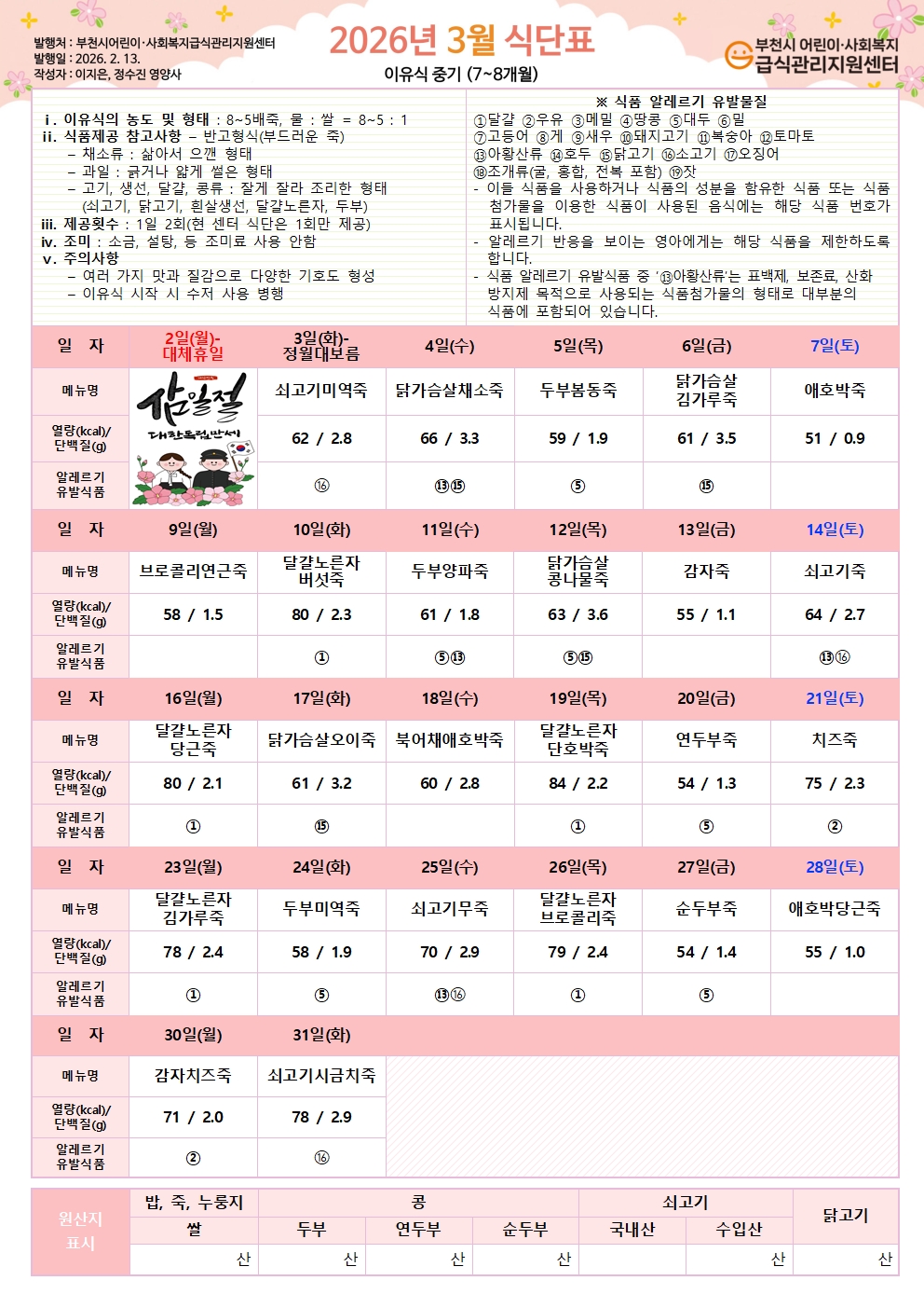 2026년 3월 식단표 이유식 초기 식단