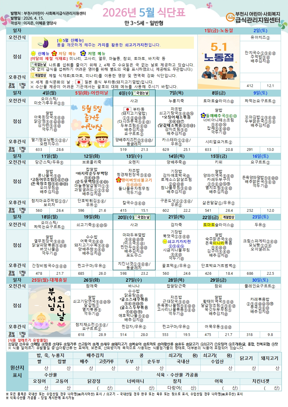 [유아식단] 2026년 5월 유아 식단 (수정-5/1 노동절 반영)