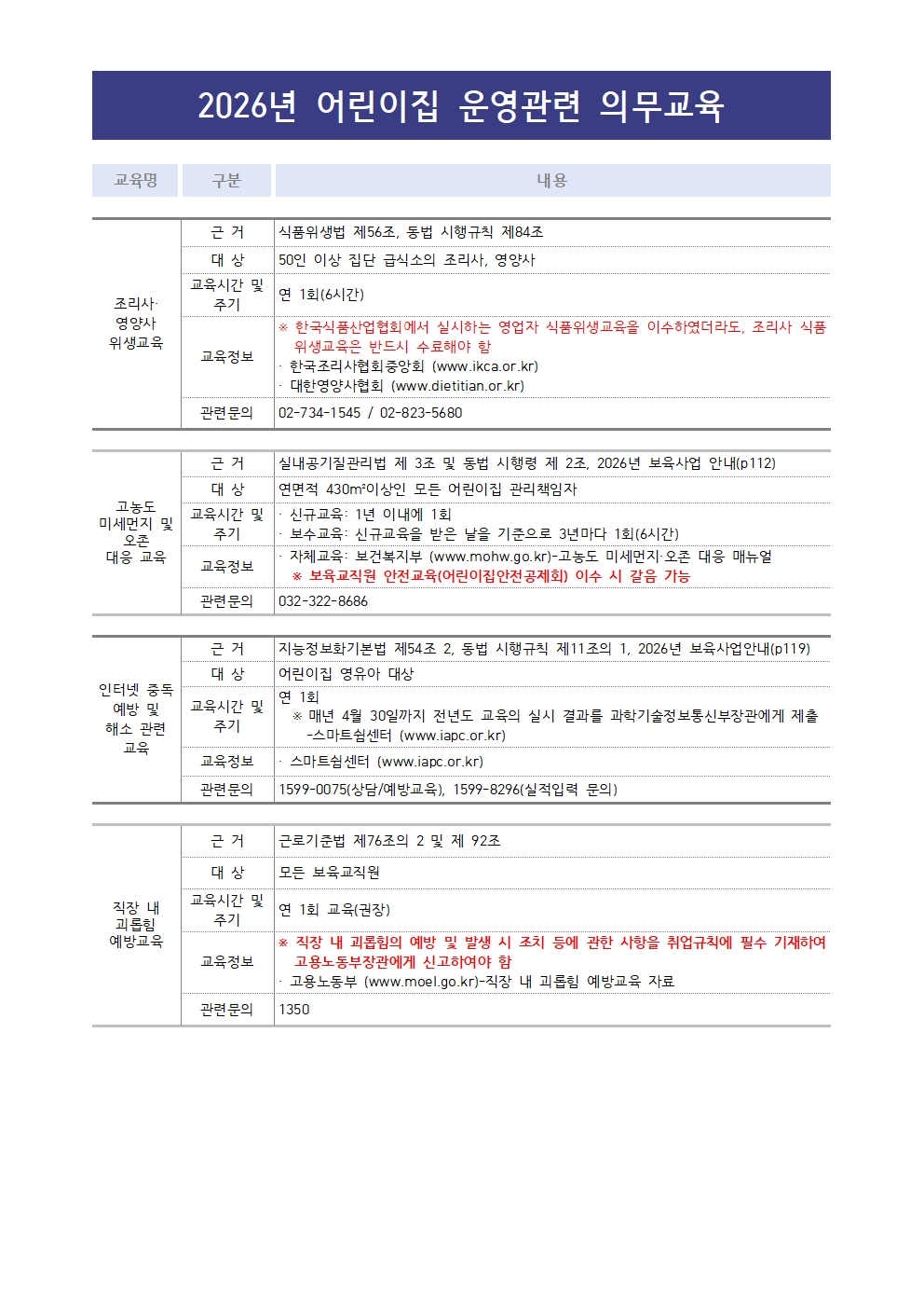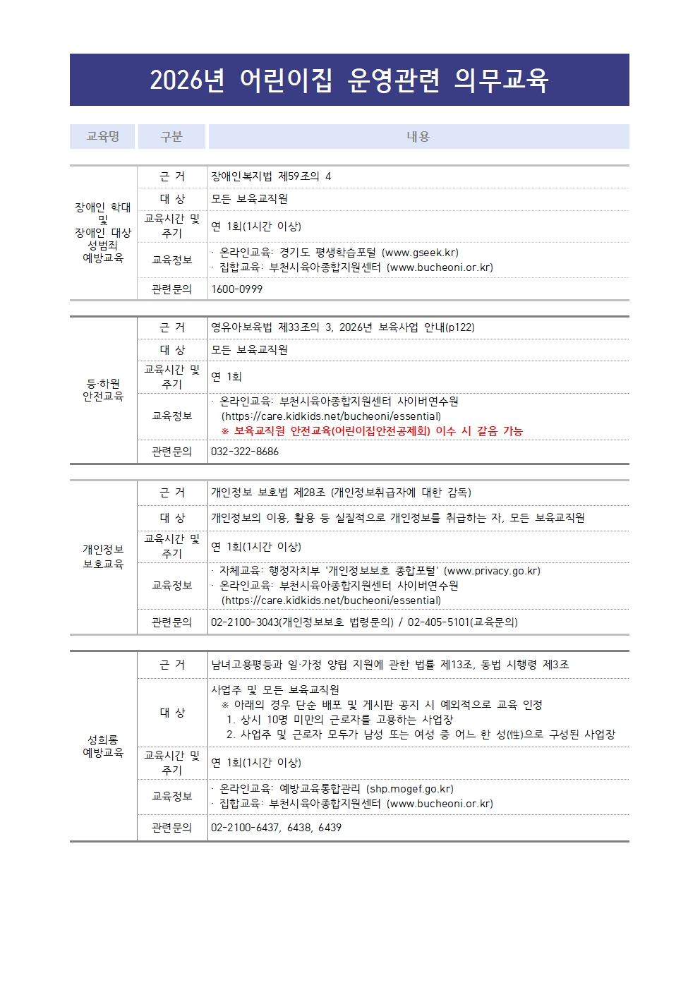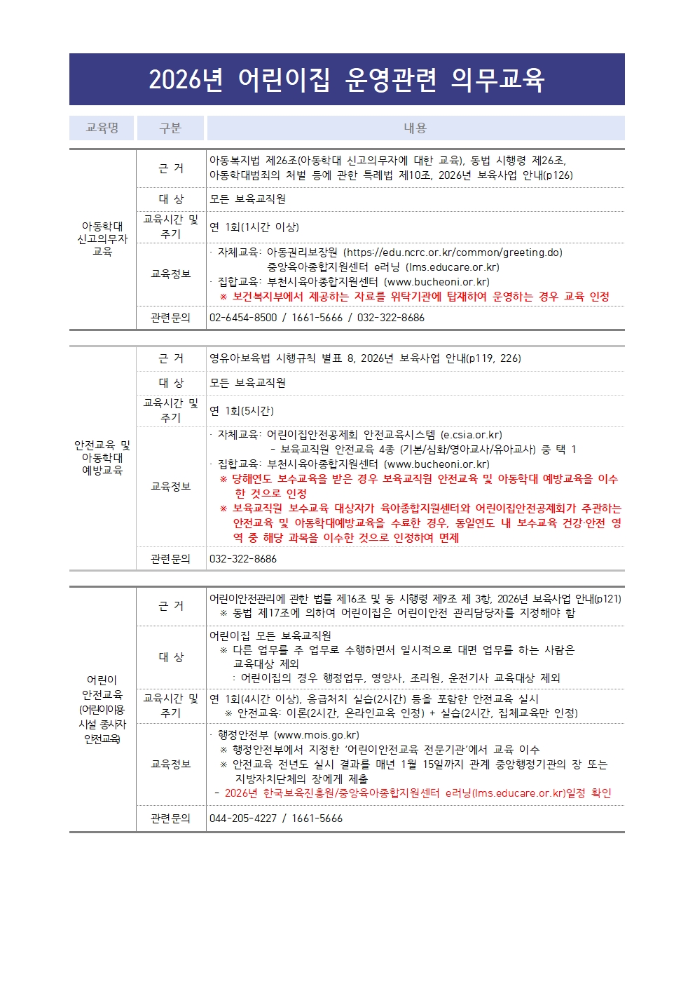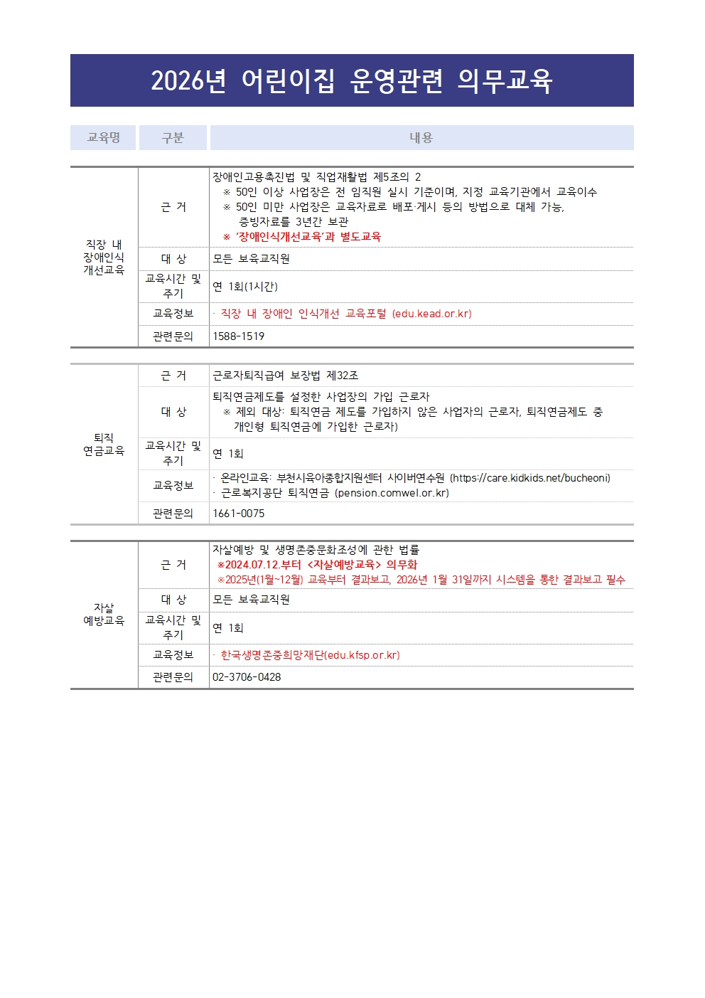 [센터] 2026년 어린이집 운영관련 의무교육 현황