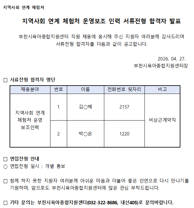 [센터] 지역사회 연계 체험처 운영보조인력 서류전형 합격자 발표