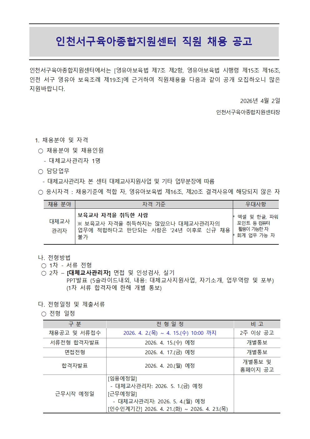 [외부] [인천서구육아종합지원센터] 직원(대체교사관리자) 채용 안내