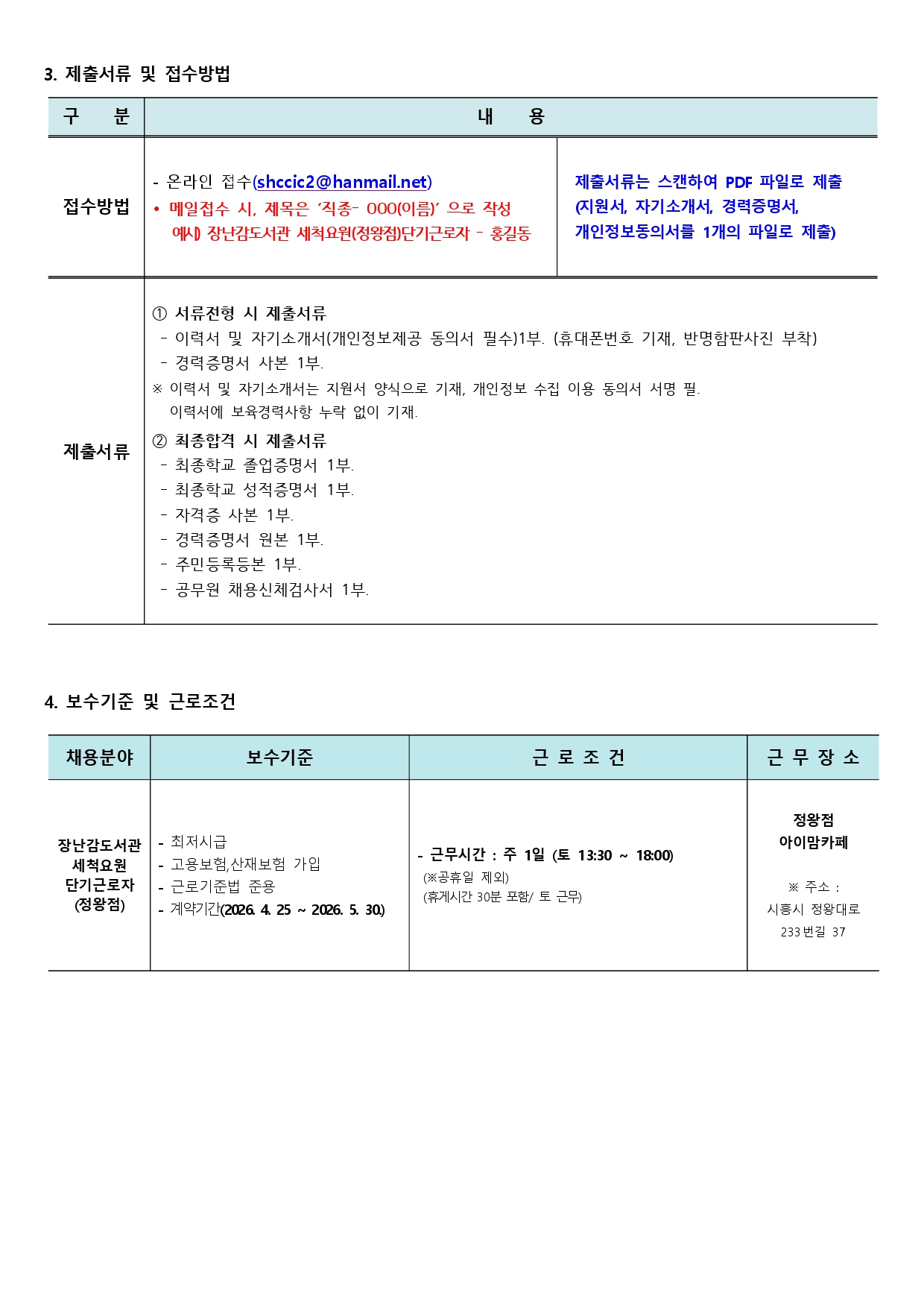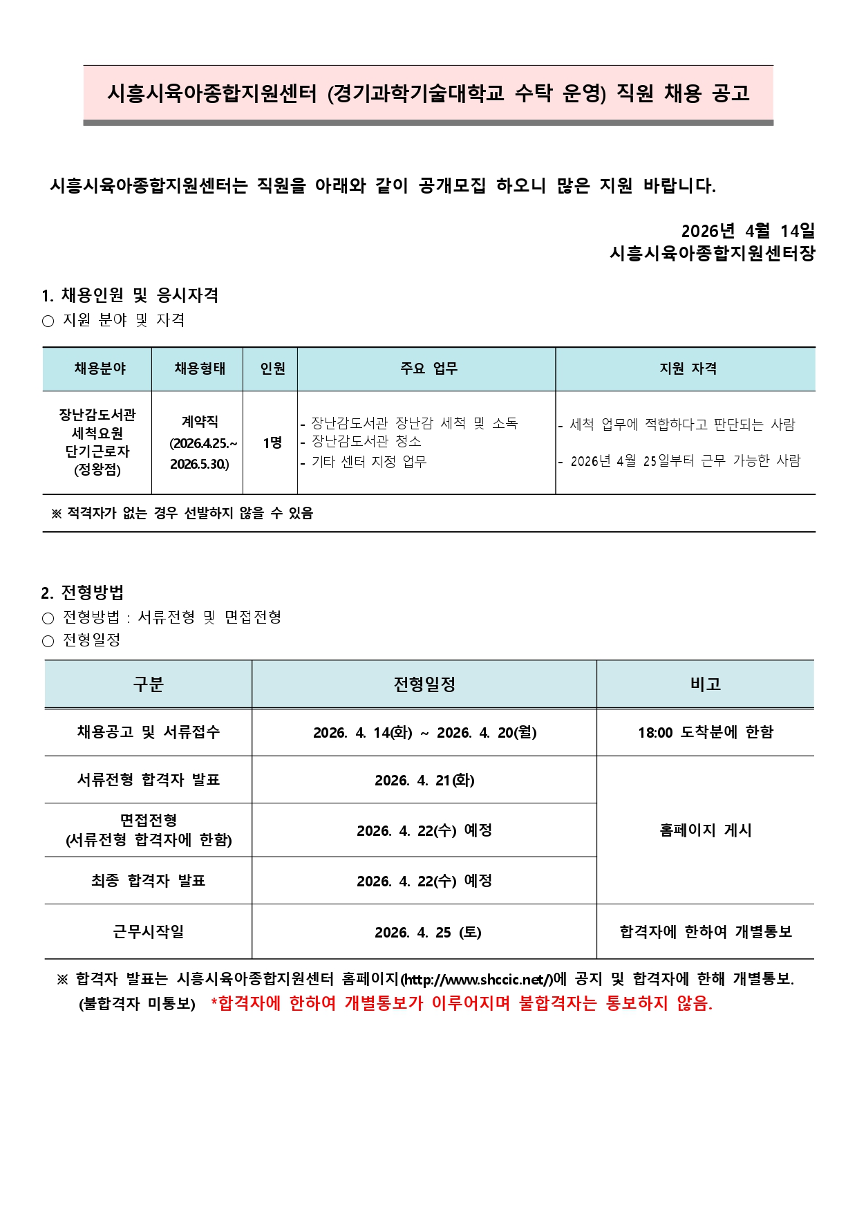 [외부] [시흥시육아종합지원센터] 직원(장난감도서관 세척요원 -정왕점) 채용 안내