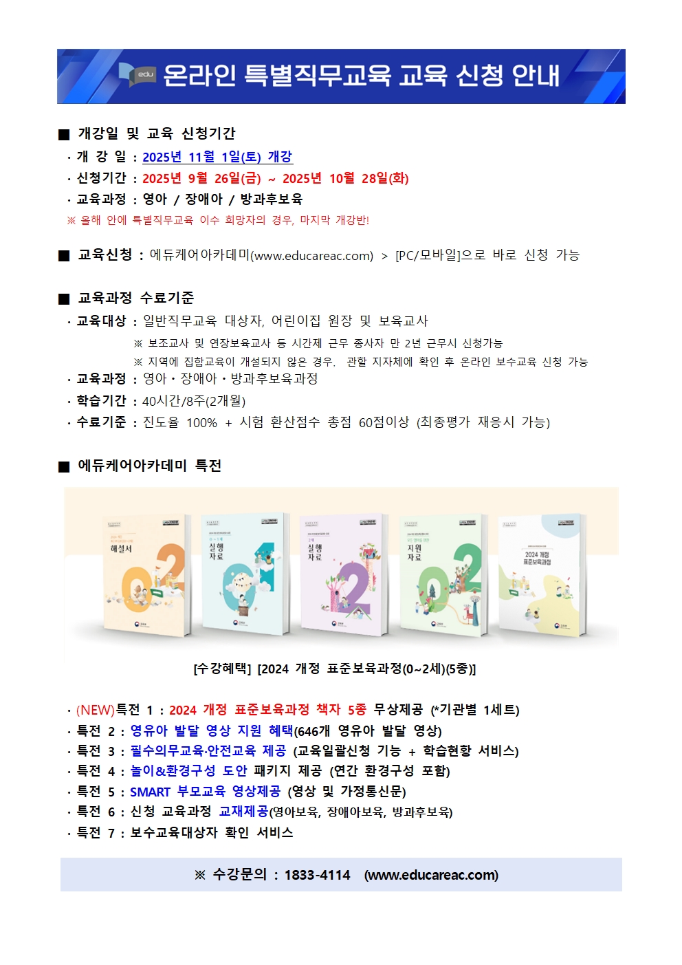[외부] [에듀케어아카데미] 온라인 특별직무교육 11월 개강반 교육신청 안내