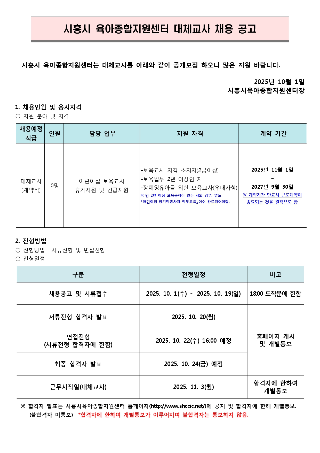 [외부] [시흥시육아종합지원센터] 직원(대체교사) 채용 안내