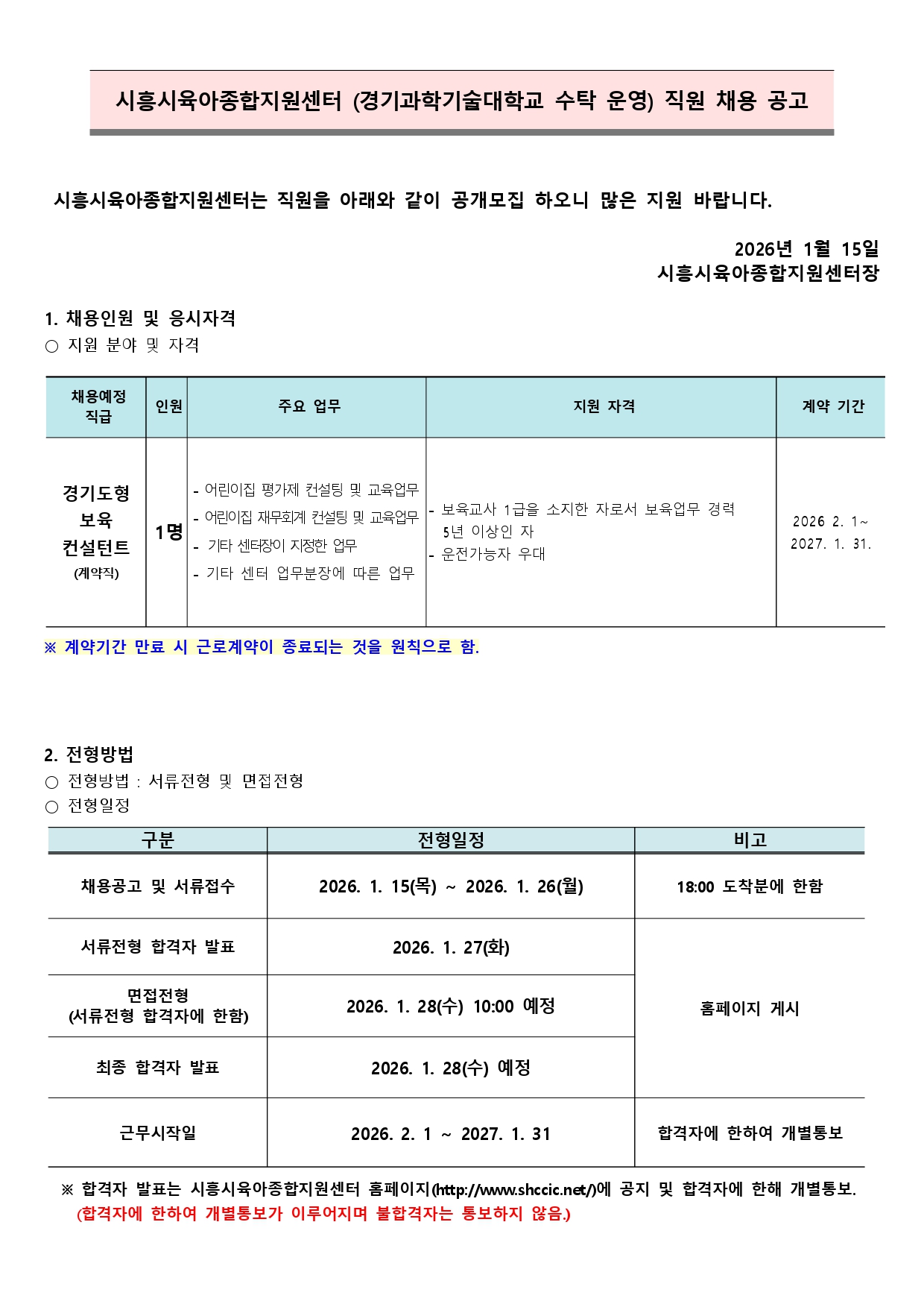 [외부] [시흥시육아종합지원센터] 직원(경기도형보육컨설턴트) 채용 재공고 안내