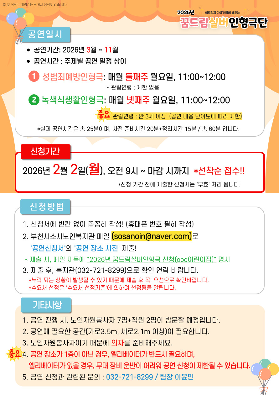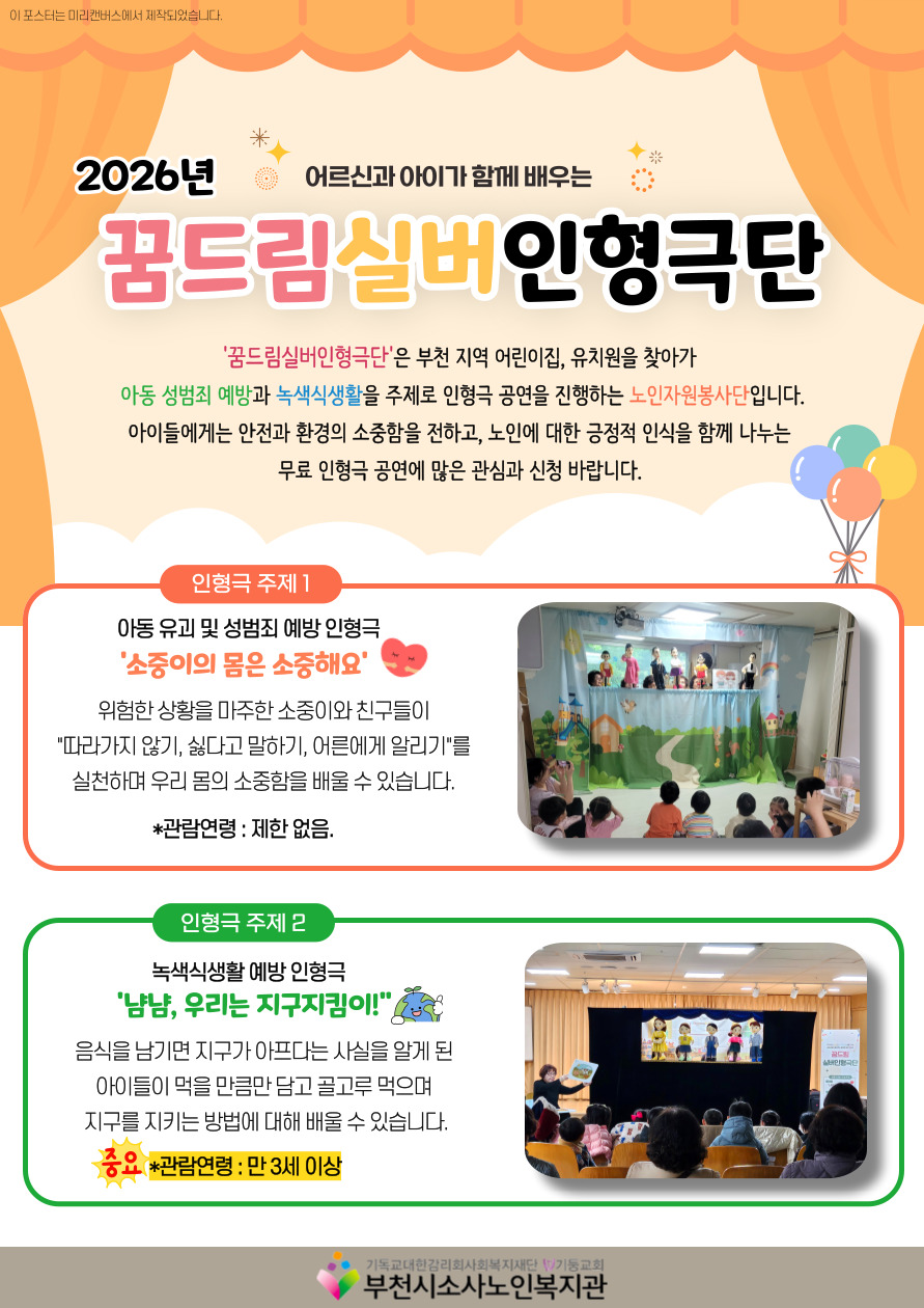 [외부] [부천시소사노인복지관] 2026년 꿈드림실버인형극 무료 공연 신청 안내 (어린이집, 유치원 대상)