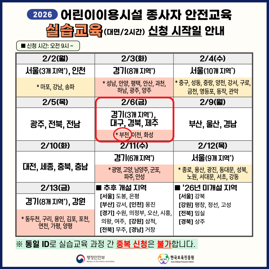 2026년도 어린이 이용시설 종사자 안전교육 신청이 2월 6일(금) 9시부터 (부천기준) 시작됩니다.