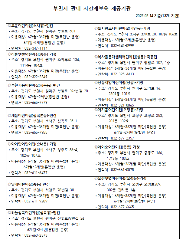 부천시 관내 시간제보육 제공기관 (25.02.14기준)