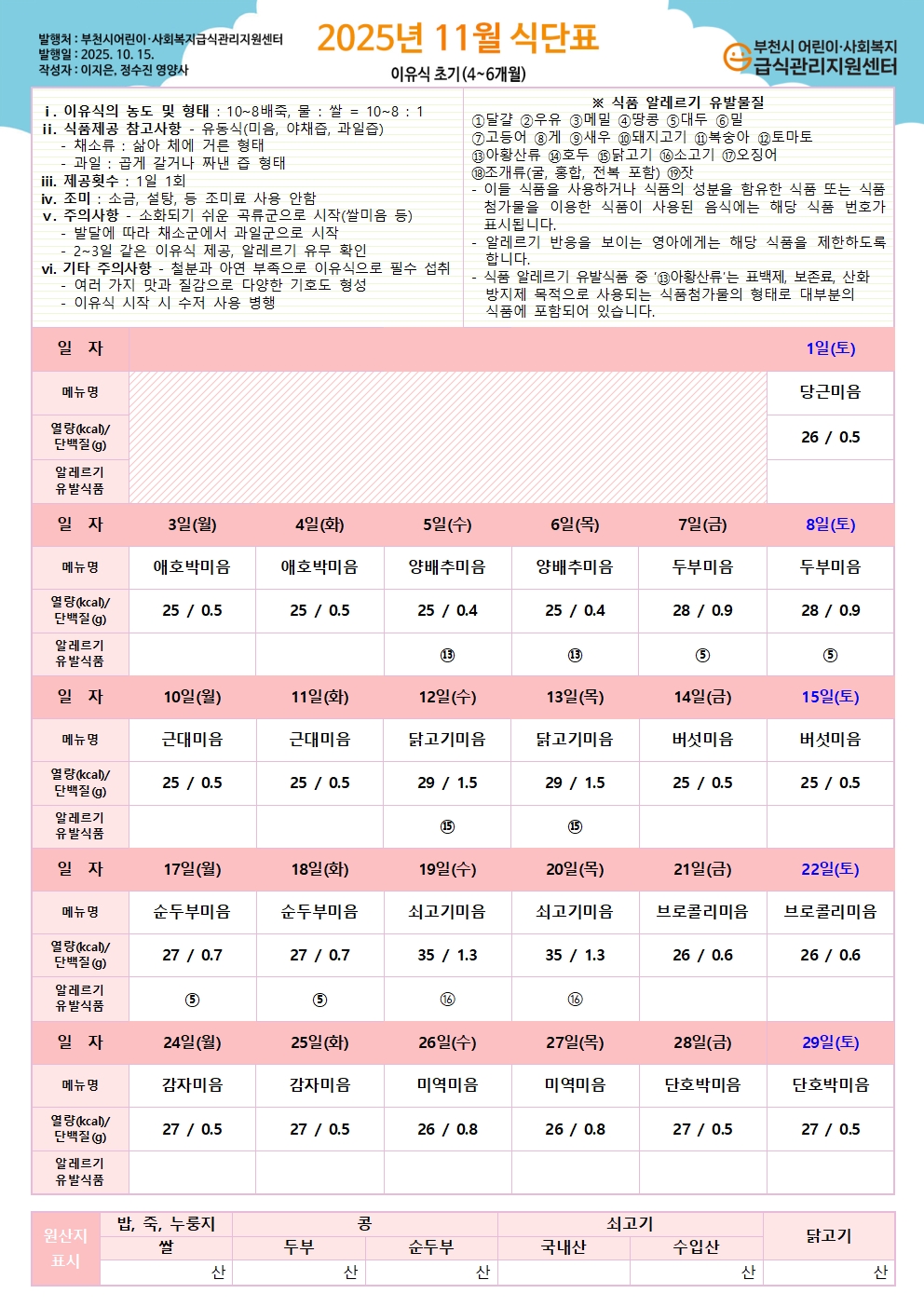 [이유식 식단] 2025년 11월 식단표 이유식 초기 식단