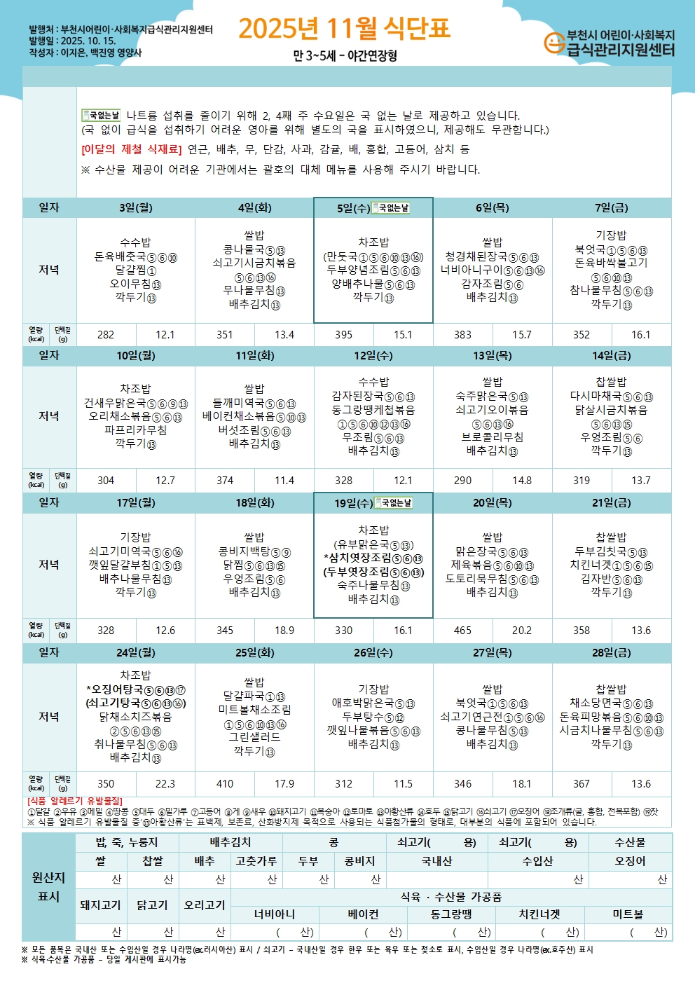 [야간연장식단] 2025년 11월 유아 야간연장 식단