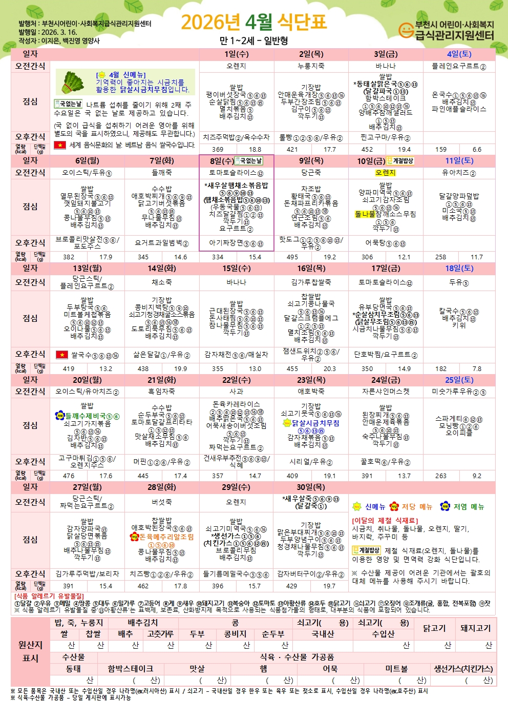 2026년 4월 유아 식단