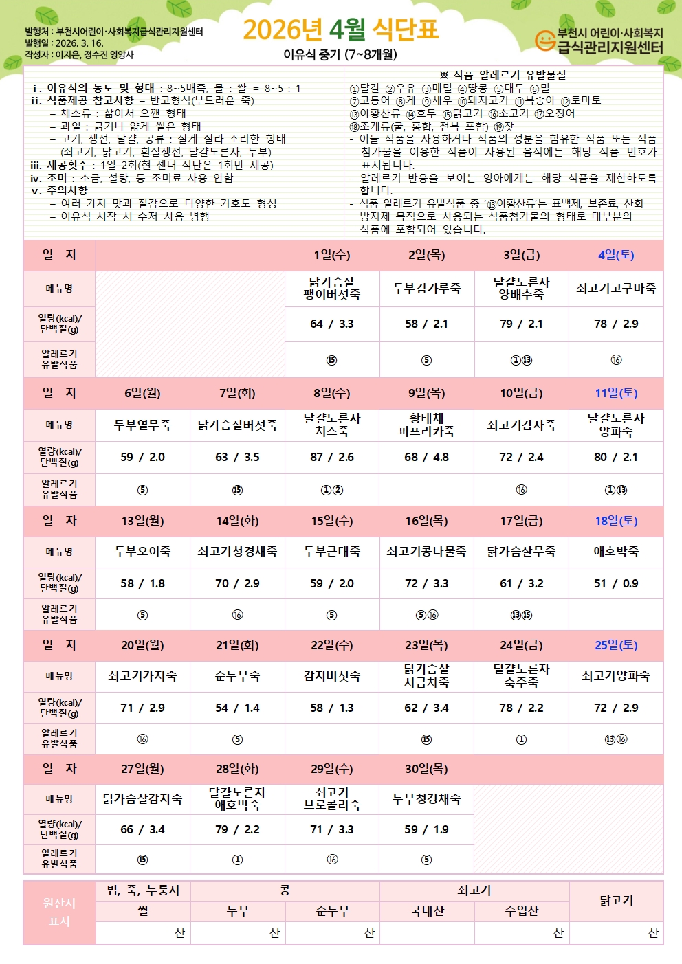 2026년 4월 식단표 이유식 초기 식단
