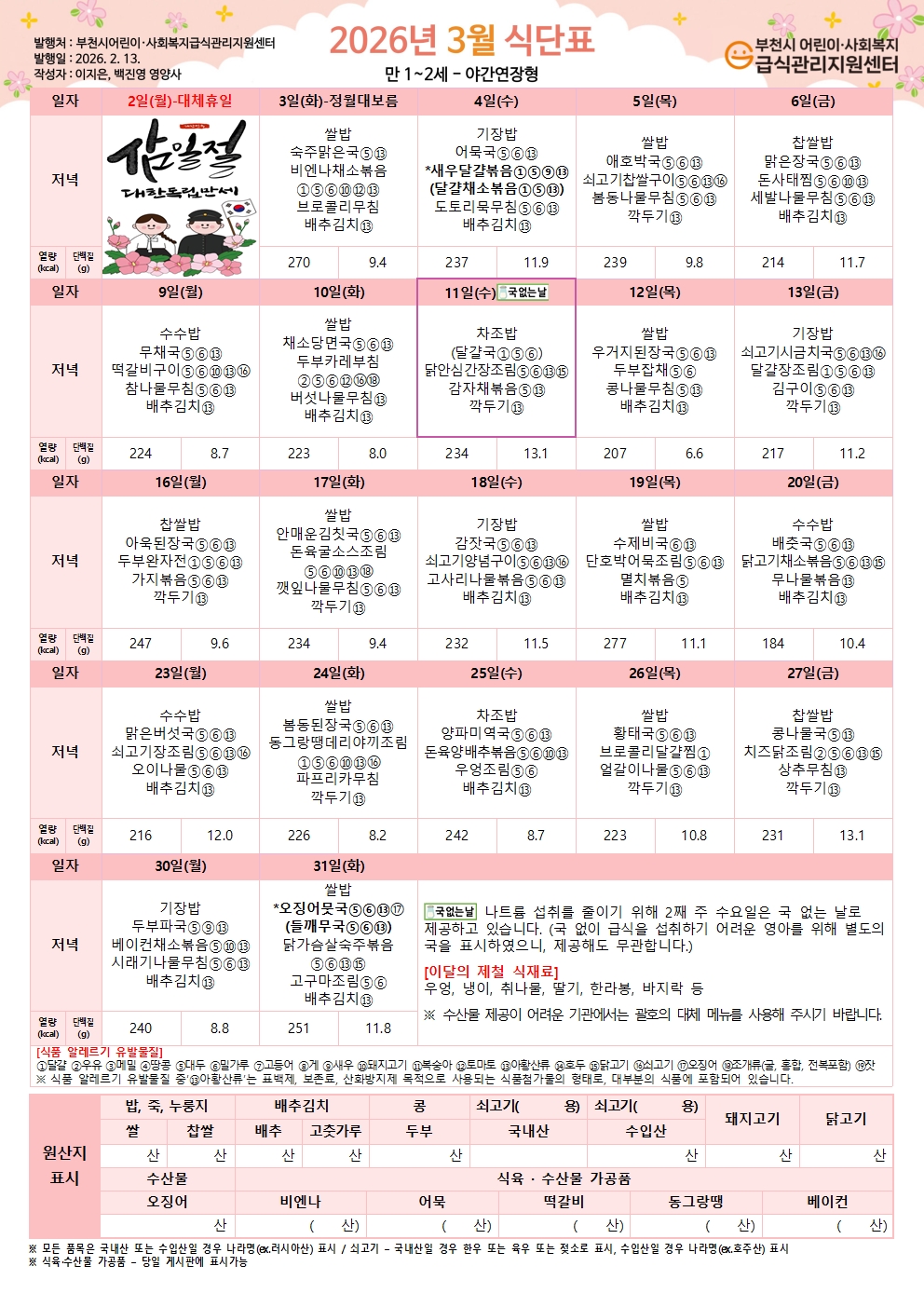 2026년 3월 유아 야간연장 식단