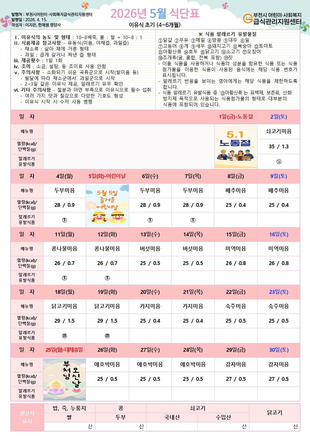 2026년 5월 식단표 이유식 중기 식단 (수정-5/1 노동절 반영)