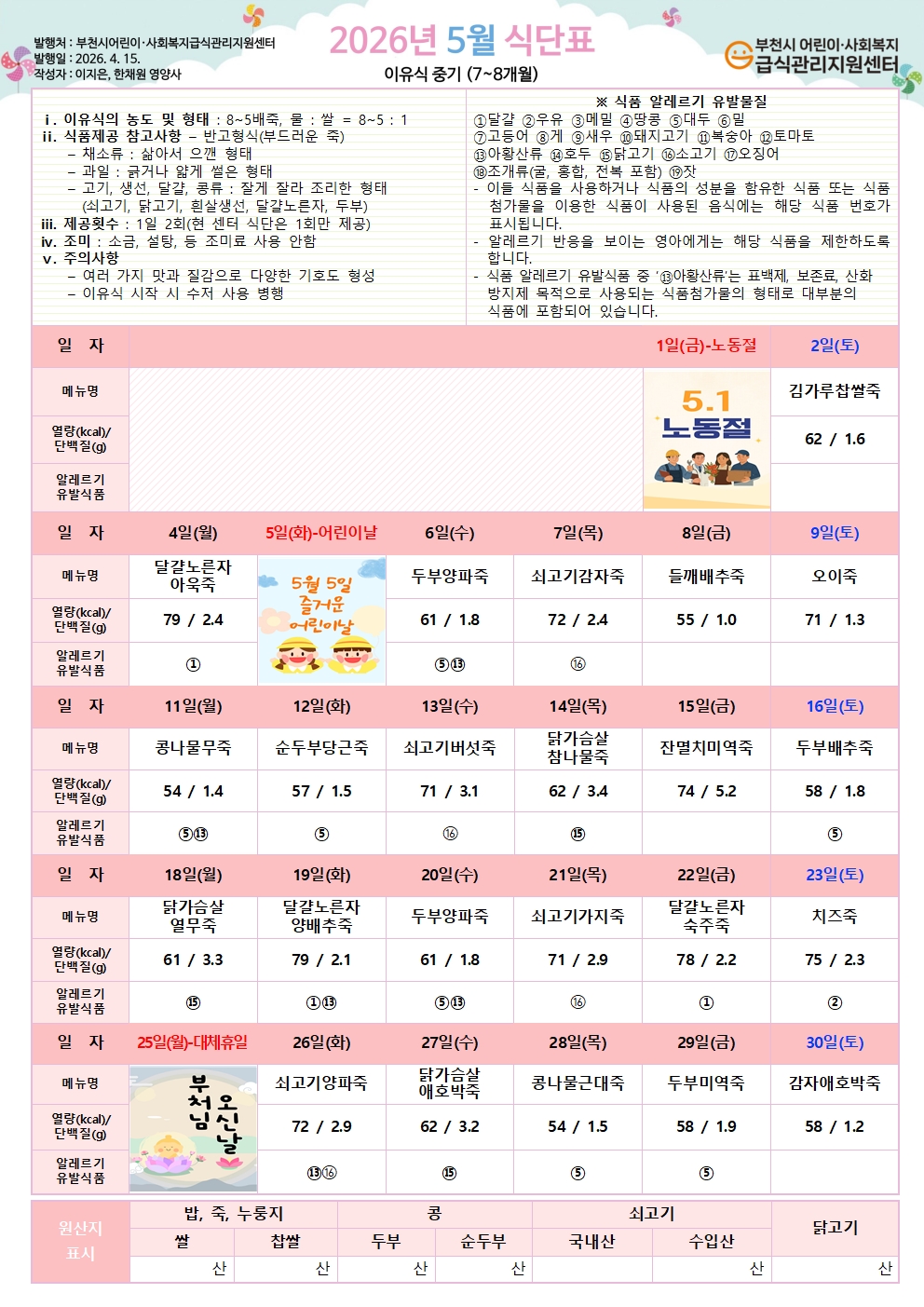 2026년 5월 식단표 이유식 초기 (수정-5/1 노동절 반영)