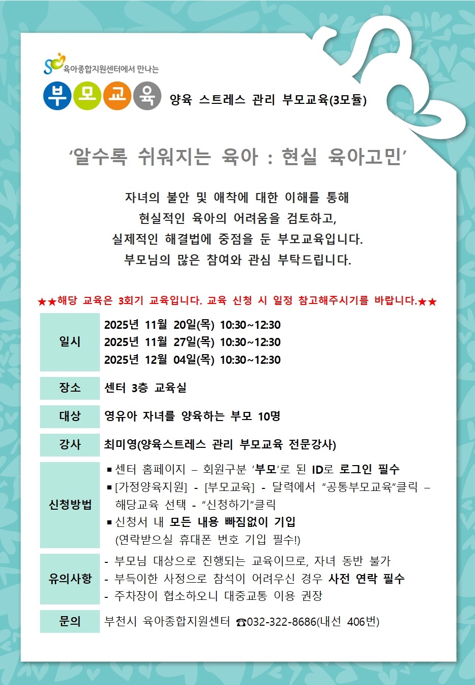[공통부모교육] 양육 스트레스 관리 부모교육 3모듈. 알수록 쉬워지는 육아 : 현실 육아고민 2025.11.20(목) 10:30 ~ 12:30