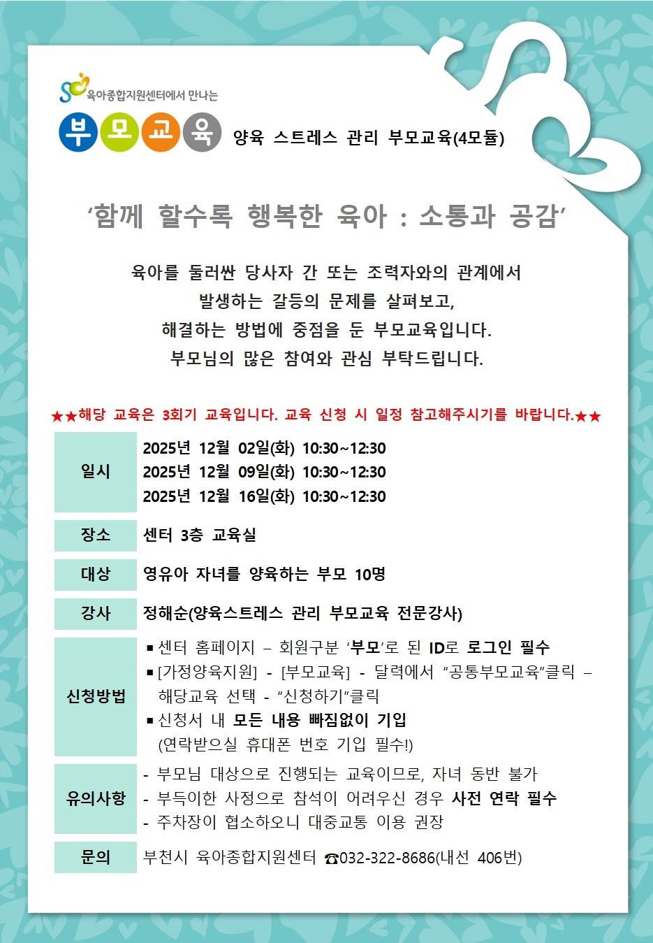 [공통부모교육] 양육 스트레스 관리 부모교육 4모듈. 함께 할수록 행복한 육아 : 소통과 공감 2025.12.02(화) 10:30 ~ 12:30