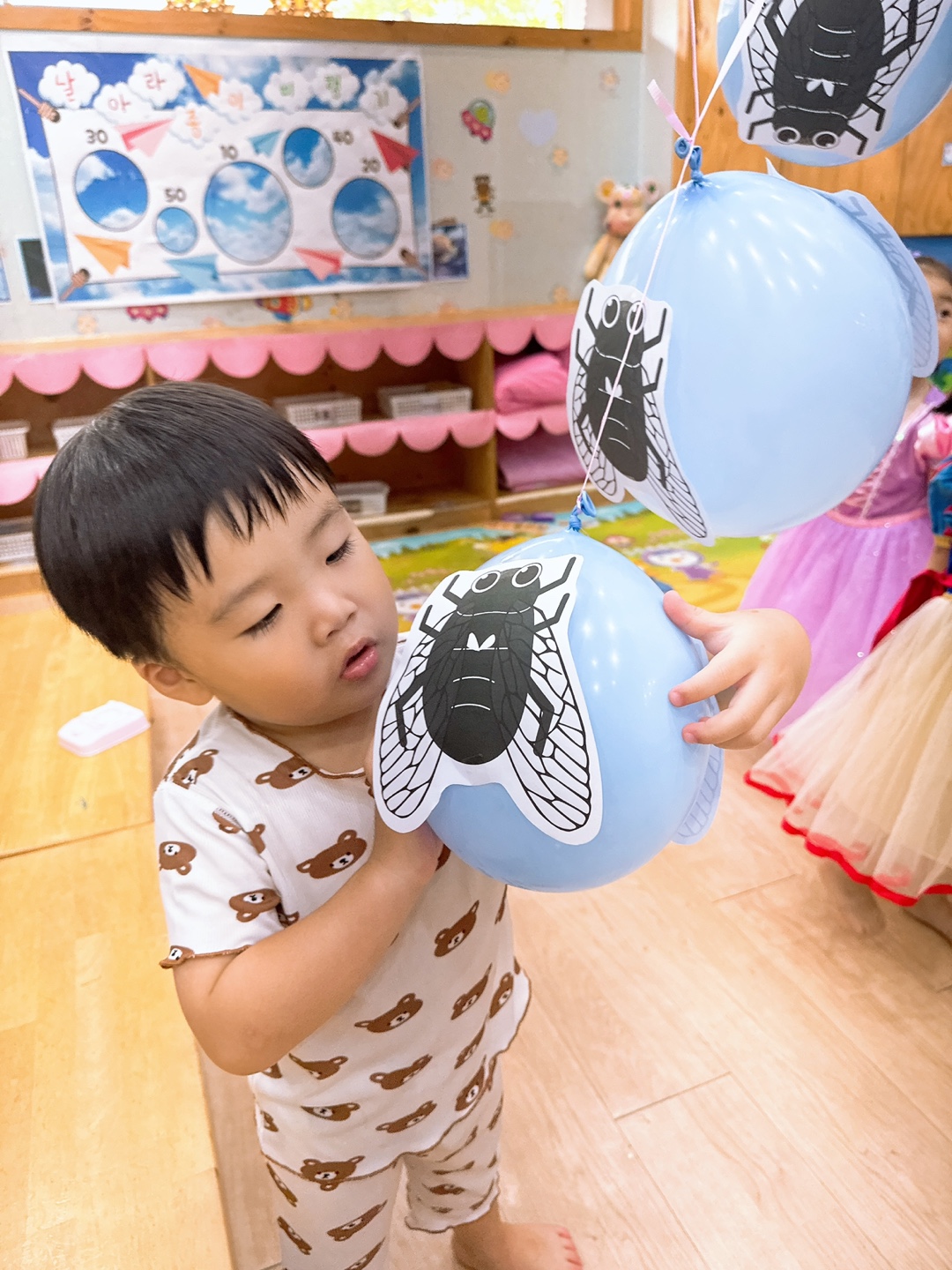만2세 친구들~맴맴 한여름의 소리꾼 매미 책을 읽고 책에서 접한 매미를 더 알아보기 위해 매미 풍선치기 놀이도 해 보고 매미 날개를 색칠해서 약명을 이용해 매미몸을 만들어 매미가 날며 오줌싸는 모습을 표현하며 책에서 본 매미를 더 자세히 느껴보았다.