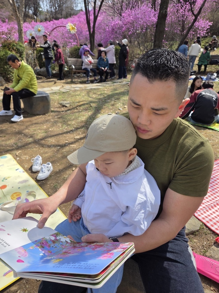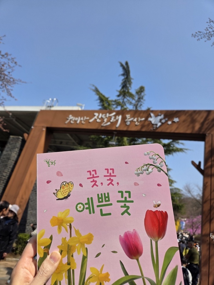 엄마, 아빠와 함께 진달래 동산에 가서 '꽃 꽃 예쁜 꽃' 그림책을 읽었어요